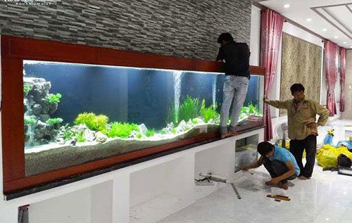 Đội ngũ nhân viên đang tiến hành thi công hồ cá cảnh trong nhà